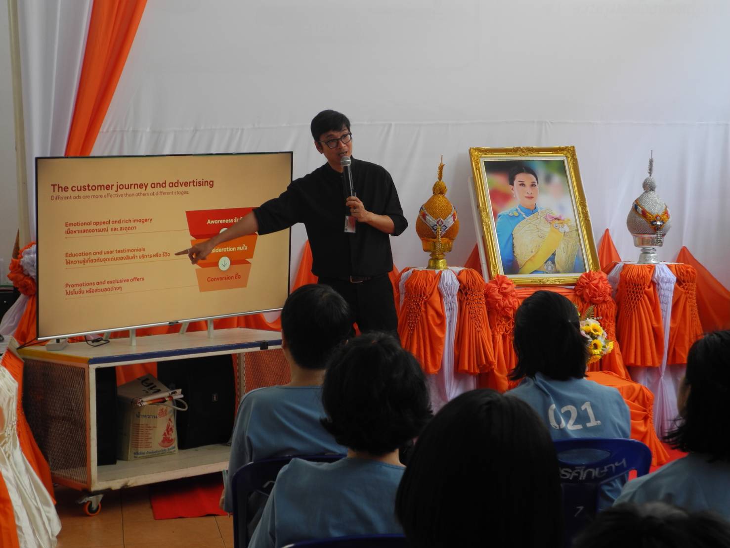 On March 13, 2568, trainers lectured on professional online marketing content creation, brand building, and the use of AI in online marketing. Participants engaged in practical workshops on techniques for presenting products online, divided into five small groups. They presented products from Khon Kaen Central Prison using live-streaming techniques. Key techniques for live-streaming included: