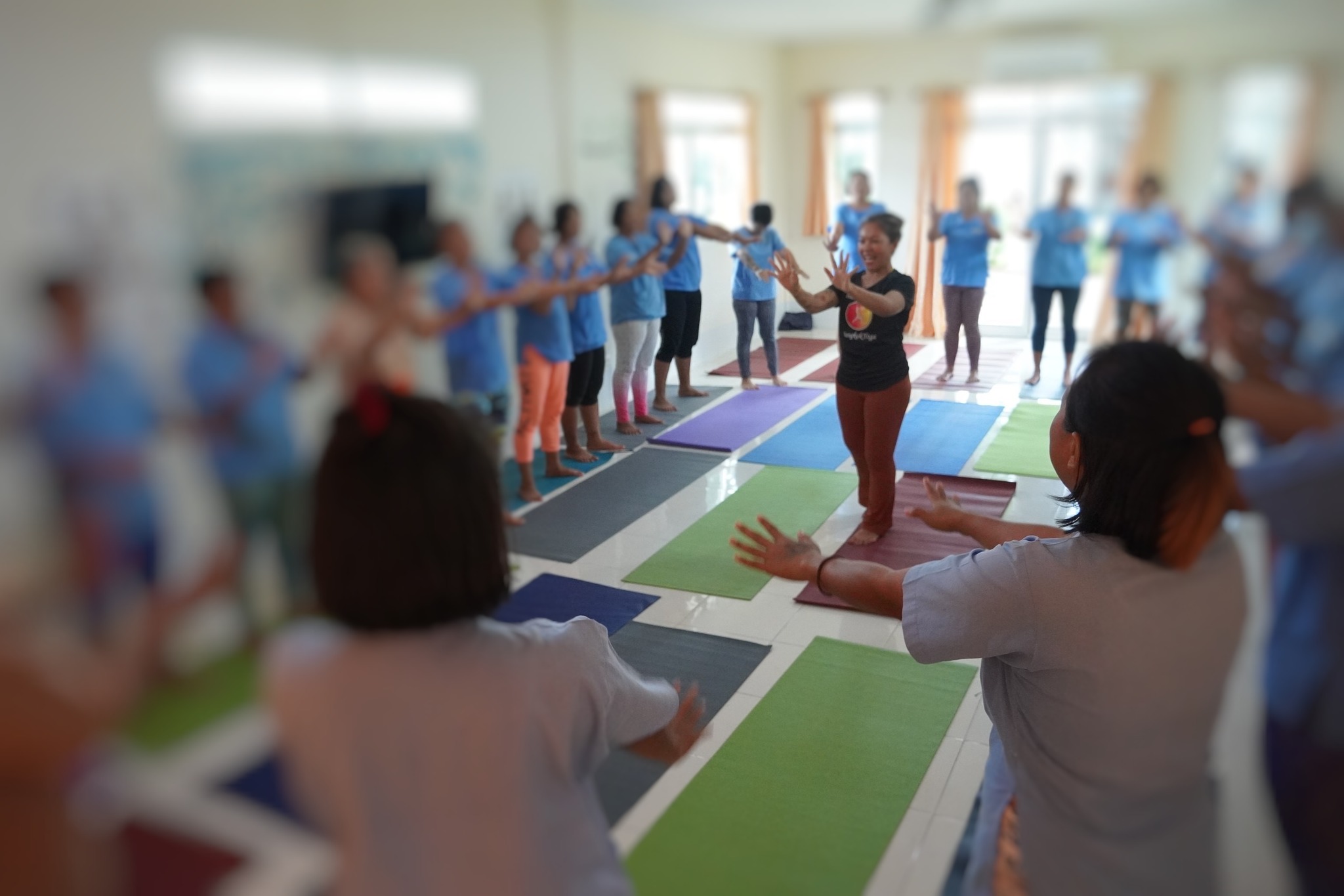 Before starting the training, the instructors conducted ice-breaking activities for the participants. They provided knowledge about yoga, including its history, types of yoga, information about muscles, bones, joints, and the use of yoga poses for physical exercise, breathing, and relaxation.