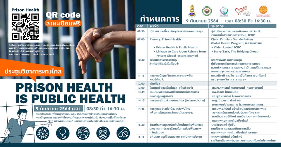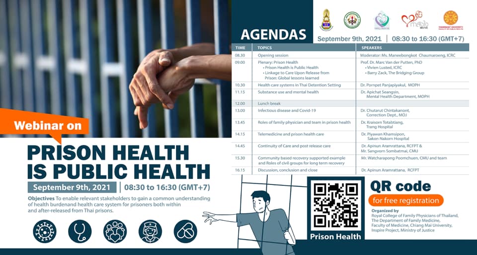 ราชวิทยาลัยแพทย์เวชศาสตร์ครอบครัวแห่งประเทศไทย ร่วมกับภาควิชาเวชศาสตร์ครอบครัว คณะแพทยศาสตร์ มหาวิทยาลัยเชียงใหม่ โครงการกำลังใจ กระทรวงยุติธรรม และคณะสาธารณสุขศาสตร์ มหาวิทยาลัยธรรมศาสตร์ จัดการประชุมวิชาการทางไกล (Webinar) เรื่อง “Prison Health is Public Health” เกี่ยวกับความสำคัญของปัญหาสาธารณสุขที่เกี่ยวข้องกับสุขภาพของผู้ต้องขัง ทั้งขณะอยู่ในเรือนจำและหลังพ้นโทษ รวมถึงแนวทางการแก้ไขอย่างเป็นระบบอย่างต่อเนื่องสำหรับเจ้าหน้าที่ของเรือนจำต่าง ๆ ทีมแพทย์เวชศาสตร์ครอบครัวของโรงพยาบาลในพื้นที่เดียวกัน และทีมระบบสุขภาพปฐมภูมิ ที่เกี่ยวข้องกับการพัฒนาสุขภาพผู้ต้องขัง ทั้งขณะอยู่ในเรือนจำและหลังพ้นโทษ รวมถึงการดูแลให้สามารถกลับเข้าสู่สังคมและใช้ชีวิตที่เป็นปกติได้ในระยะยาว โดยการประชุมวิชาการทางไกล (Webinar) จะจัดขึ้นในวันพฤหัสบดีที่ 9 กันยายน พ.ศ.2564 เวลา 8.30 – 16.30 น. ผ่านระบบ Video Conference โปรแกรม Zoom Webinar ที่เว็บไซต์ www.thaiprisonhealth.org ผู้ที่สนใจเข้าร่วมรับฟังสามารถสมัครลงทะเบียน online ฟรี ได้ที่ www.thaiprisonhealth.org หรือสแกนตาม QR Code ตามรูป