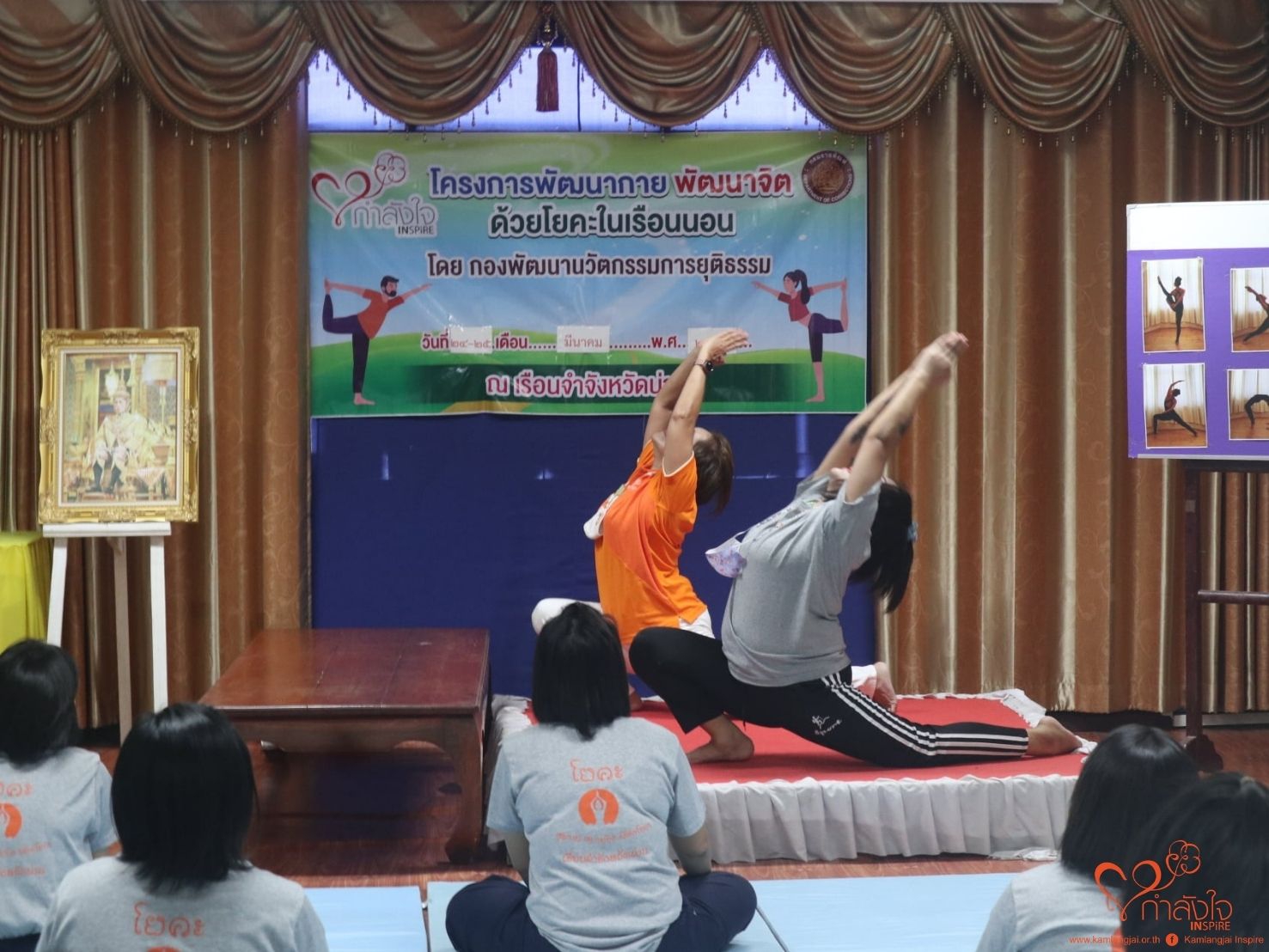 เมื่อวันที่ 24 – 26 มีนาคม 2564 โครงการกำลังใจฯ โดยกองพัฒนานวัตกรรมการยุติธรรม ได้เข้าติดตามการดำเนินโครงการพัฒนากายพัฒนาจิตด้วยโยคะในเรือนนอน ณ เรือนจำจังหวัดน่าน นำโดยแม่ครูศิริวรรณ โสภารัตน์ วิทยากร ซึ่งได้ให้ความรู้ การมีสติในการทำอะไร ให้รู้คิดรู้ธรรม ฝึกสมาธิ และให้ผู้เข้าอบรมทบทวนท่าโยคะที่เคยฝึกไป วิทยากรได้แนะนำแก้ไขและเพิ่มการฝึกท่าโยคะ ในท่าต่างๆ ที่ถูกต้อง เช่น ท่านอน เพื่อแก้อาการปวดหลัง ปวดท้อง ปวดศรีษะ และเพิ่มเติมการฝึกท่าโยคะแบบฟ้อนรำโดยมีดนตรีประกอบเพลง และได้ให้คำแนะนำเพิ่มเติมเกี่ยวกับการปฏิบัติขั้นต่อไป โดยมีผู้เข้ารับการฝึกอบรมฯ จำนวน 25 คน​