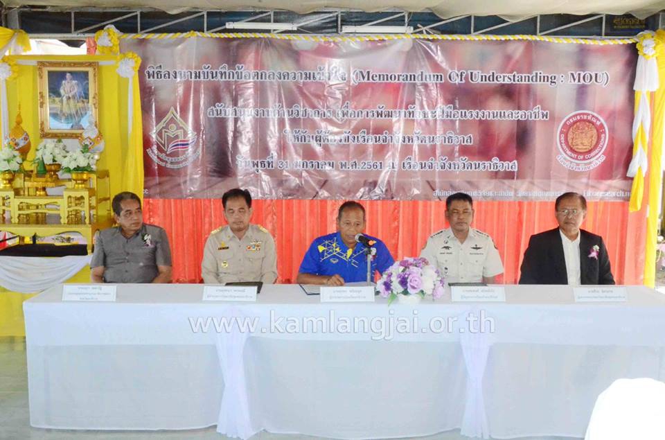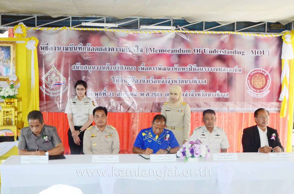 เมื่อวันที่ 31 มกราคม 2561 โครงการกำลังใจ ร่วมกับกรมราชทัณฑ์ ด้วยการสนับสนุนจากสำนักงานกองทุนสนับสนุนการสร้างเสริมสุขภาพ (สสส.) จัดอบรมหลักสูตรเย็บซ่อมรองเท้า วิชาชีพด้านศาสตร์พยากรณ์ และการออกแบบลายผ้า เพื่อให้ผู้ต้องขังที่เข้าร่วมโครงการได้มีอาชีพติดตัวออกไปโดยไม่คิดหวนคืนกลับเข้ามาอีก โดยมีนายหัสดิน กิจจญาณสกุล และนายวาทิศ สิทธิบรรณ เป็นวิทยากรฝึกอบรมแก่ผู้ต้องขังชาย รุ่นที่ 2 จำนวน 40 คน และโครงการฝึกวิชาชีพด้านศาสตร์พยากรณ์ โดยวิทยากร นายเอกลักษณ์ ประเสริฐสุข ฝึกอบรมแก่ผู้ต้องขังชาย 20 คน และผู้ต้องขังหญิง 20 คน ในระหว่างวันที่ 31 มกราคม – 2 กุมภาพันธ์ 2561 ทั้งนี้ เรือนจำจังหวัดนราธิวาส ปัจจุบันมีผู้ต้องขังรวมทั้งสิ้น 1,090 คน เป็นผู้ต้องขังชาย 1,786 คน และผู้ต้องขังหญิง 114 คน โดยเรือนจำจังหวัดนราธิวาส นำโดยนายสมพงษ์ สนิทมัจโร ผู้บัญชาการเรือนจำจังหวัดนราธิวาส ได้จัดโครงการต่างๆ เพื่อผู้ต้องขังมากมาย นอกจากโครงการฝึกอบรมโดยโครงการกำลังใจในพระดำริฯ แล้ว อาทิ ทำบันทึกข้อตกลงความเข้าใจกับวิทยาลัยชุมชนนราธิวาส ในการจัดการฝึกอบรมหลักสูตรประกาศนียบัตรขนมอบเพื่อการค้าให้แก่ผู้ต้องขังหญิงเรือนจำจังหวัดนราธิวาส นอกจากนี้ผู้บัญชาการเรือนจำจังหวัดนราธิวาสเน้นย้ำว่า ตนเองจะมุ่งมั่นทำหน้าที่ ดูแลและปกครองผู้ต้องขังทั้งหมดในเรือนจำแห่งนี้อย่างดีที่สุด ทั้งนี้เพื่อให้เป็นเรือนจำสีขาวตลอดไป