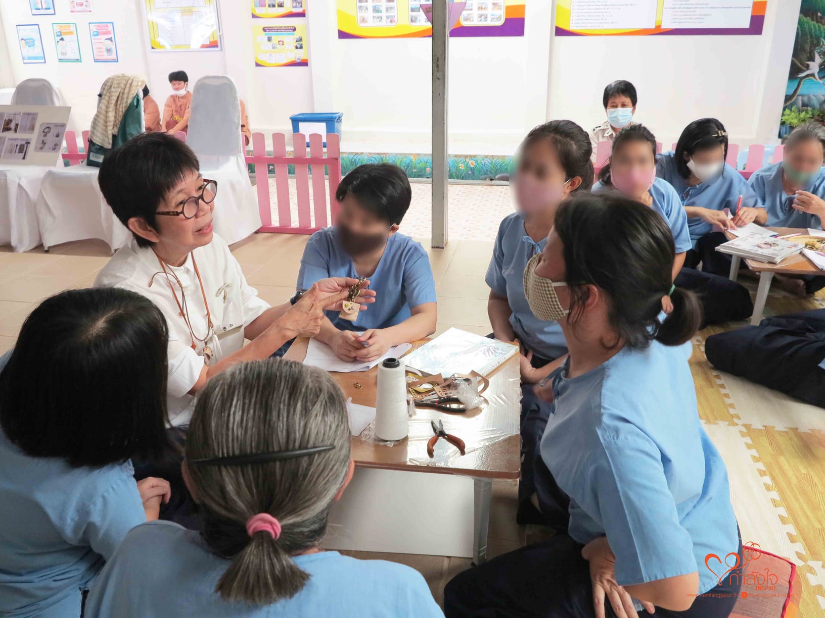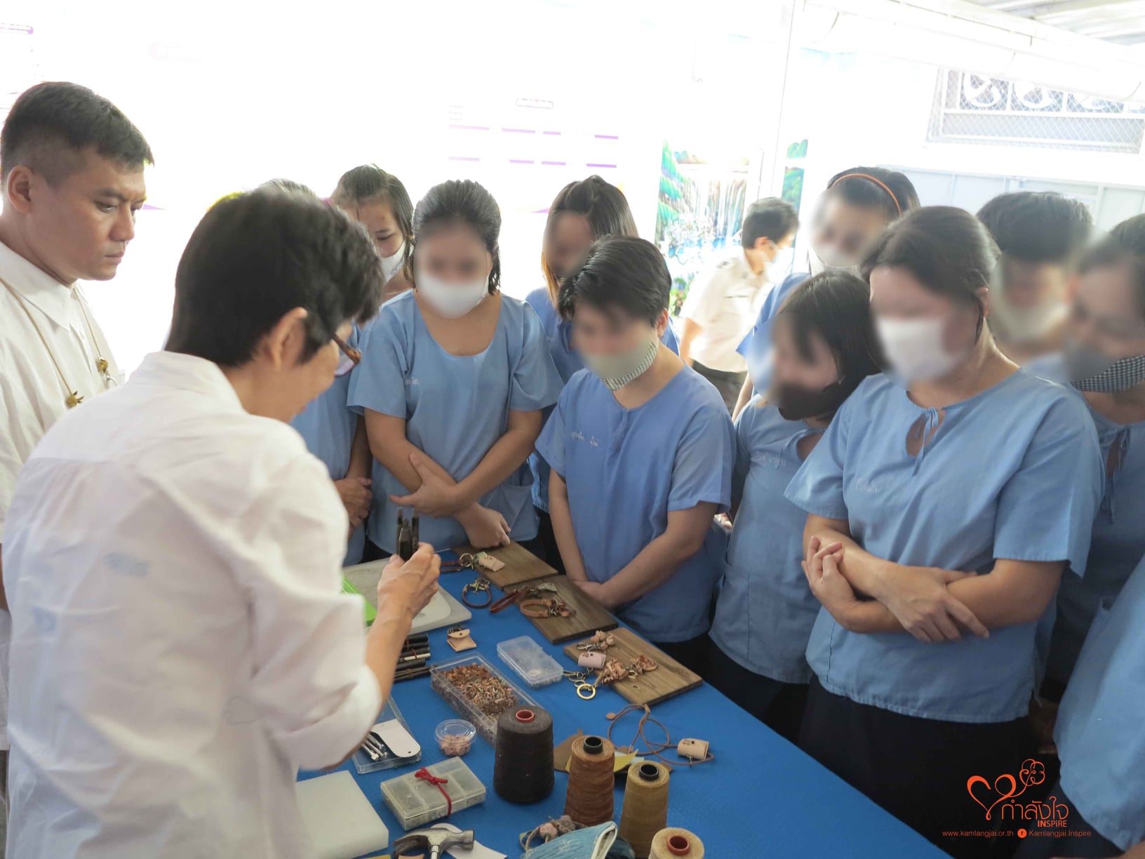 ภายหลังผู้ต้องขังได้รู้ขั้นตอนการทำแล้ว วิทยากรได้แนะนำให้รู้จักอุปกรณ์ เช่น หนัง ด้ายเทียน ที่รองตอก ค้อน หมุดเล็ก พิมพ์กดรูปต่างๆ เป็นต้น จากนั้นได้อธิบายและฝึกปฏิบัติไปพร้อมๆกัน โดยแนะนำทคนิคการเลือกใช้หนัง โดยหนังที่นำมาให้เรียนนี้ เป็นหนังวัว มีทั้งแบบฟอกฝาด และฟอกสี ซึ่งเป็นสี Earth Tone ที่นิยมนำไปทำผลิตภัณฑ์ การตัดหนังให้สวยงามคือการตัดชิดเส้นแบบที่สุด การตอกหมุดให้เรียบร้อย การเย็บด้วยด้ายเทียน การร้อยลูกปัดการประดับตกแต่ง ซึ่งวิทยากรได้ให้ความรู้อย่างละเอียด และให้เทคนิคการออกแบบ โดยแนะนำการออกแบบไม่มีอะไรถูกหรือผิด เราจะเน้นที่ความสวยงาม และฝีมือการผลิต ในบางครั้งวันนี้เราเพิ่งเริ่มต้นยังทำได้ไม่สวยงามมฃ เราก็ยังสามารถแก้ไขผลงานโดยการแก้ไขส่วนที่ทำไม่สวย (รื้อ) หรือค่อยๆทำใหม่ เมื่อเราทำจนชำนาญขึ้นเราจะได้รับผลงานที่มีความสวยงาม และนำไปขายได้จริง อย่างพวงกุญแจที่อาจารย์นำมาสอนนี้ในท้องตลาดขายในราคาชิ้นละ 300 บาท ดังนั้น ขอให้มีความตั้งใจในการออกแบบและพัฒนาเป็นผลิตภัณฑ์ที่สวยงาม ซึ่งตลาดยังเปิดรับผู้ผลิตรายใหม่ๆอยู่เสมอ และอาชีพผลิตสินค้าเหล่านี้เราสามารถทำที่บ้านได้ด้วย เป็นสิ่งที่เราเริ่มต้นด้วยตนเองได้จริง