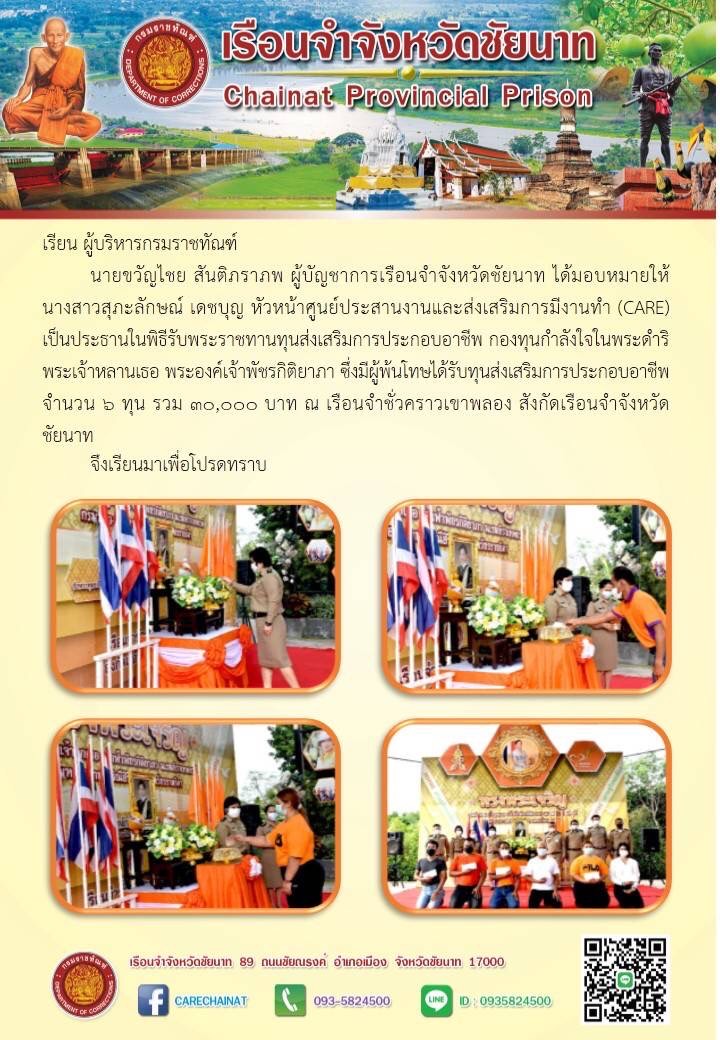 เรือนจำจังหวัดชัยนาท รับพระราชทานทุนส่งเสริมการประกอบอาชีพ กองทุนกำลังใจในพระดำริฯ