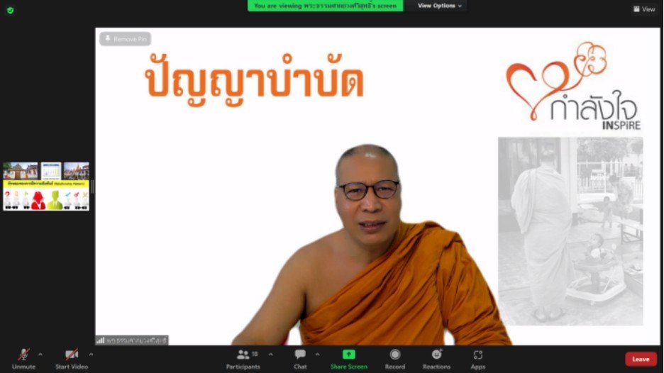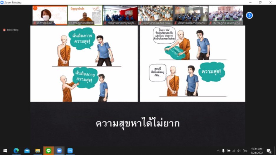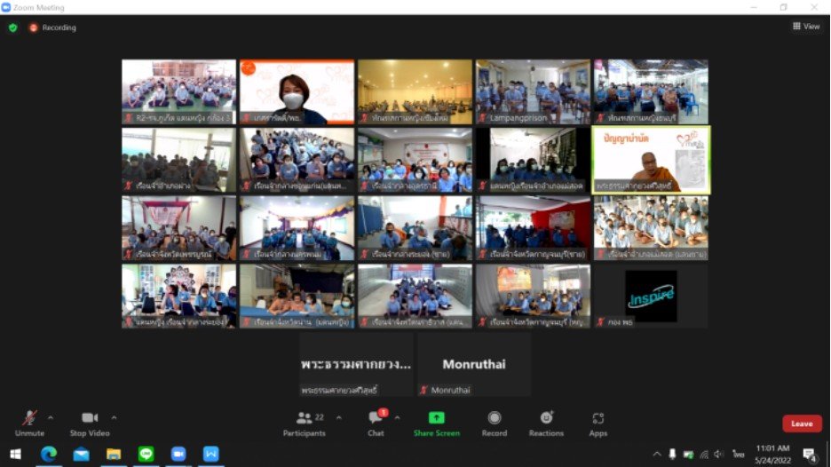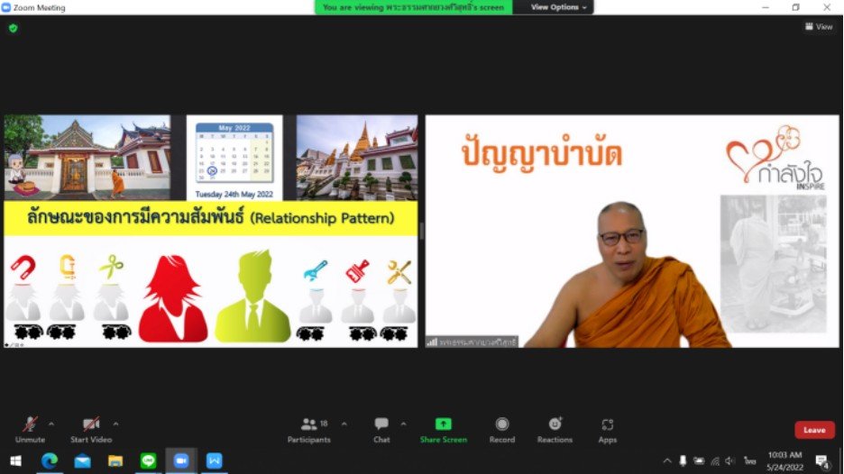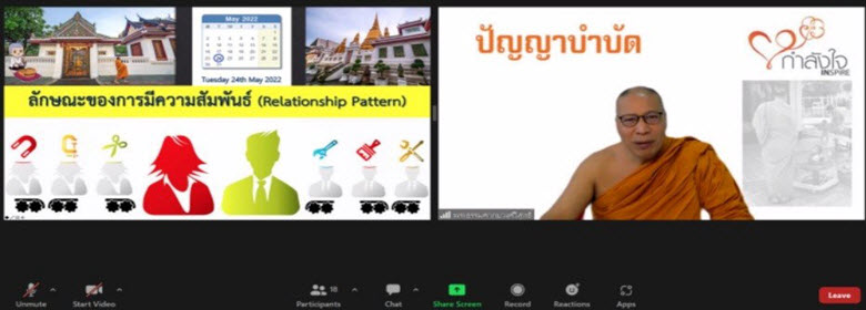 วันที่ 24 พฤษภาคม 2565 เวลา 10.00 น. พระธรรมศากยวงศ์วิสุทธิ์ (อนิลมาน ธมฺมสากิโย) ผู้ช่วยเจ้าอาวาสวัดบวรนิเวศวิหาร พระวิทยากรในการดำเนินงานโครงการปัญญาบำบัด ได้บรรยายให้ความรู้ผู้ต้องขัง ในรูปแบบการสอนออนไลน์ผ่านโปรแกรม Zoom ในหัวข้อ “ลักษณะของการมีความสัมพันธ์ (Relationship Pattern)” ต่อเนื่องจากวันที่ 10 พฤษภาคม 2565 เนื้อหาเกี่ยวกับเรื่องความสุข การคิดอย่างมีความสุข เช่น ความสุขคือไม่ใช่มีทุกสิ่งที่ตนต้องการ แต่พอใจกับทุกสิ่งที่ตนมี ความสุขคือไม่ใช่ไม่มีปัญหา แต่เป็นความสามารถในการแก้ปัญหา เป็นต้น การจัดโครงการในครั้งนี้มีเรือนจำในโครงการกำลังใจที่เข้าร่วมอบรม จำนวน 14 แห่ง ได้แก่ เรือนจำกลางลำปาง เรือนจำกลางอุดรธานี เรือนจำกลางระยอง เรือนจำกลางนครพนม เรือนจำกลางขอนแก่น เรือนจำจังหวัดน่าน เรือนจำจังหวัดกาญจนบุรี เรือนจำจังหวัดภูเก็ต เรือนจำจังหวัดนราธิวาส เรือนจำจังหวัดเพชรบูรณ์ ทัณฑสถานหญิงเชียงใหม่ ทัณสถานหญิงธนบุรี เรือนจำอำเภอฝาง และเรือนจำอำเภอแม่สอด มีผู้เข้าอบรมรวมจำนวน 432 คน