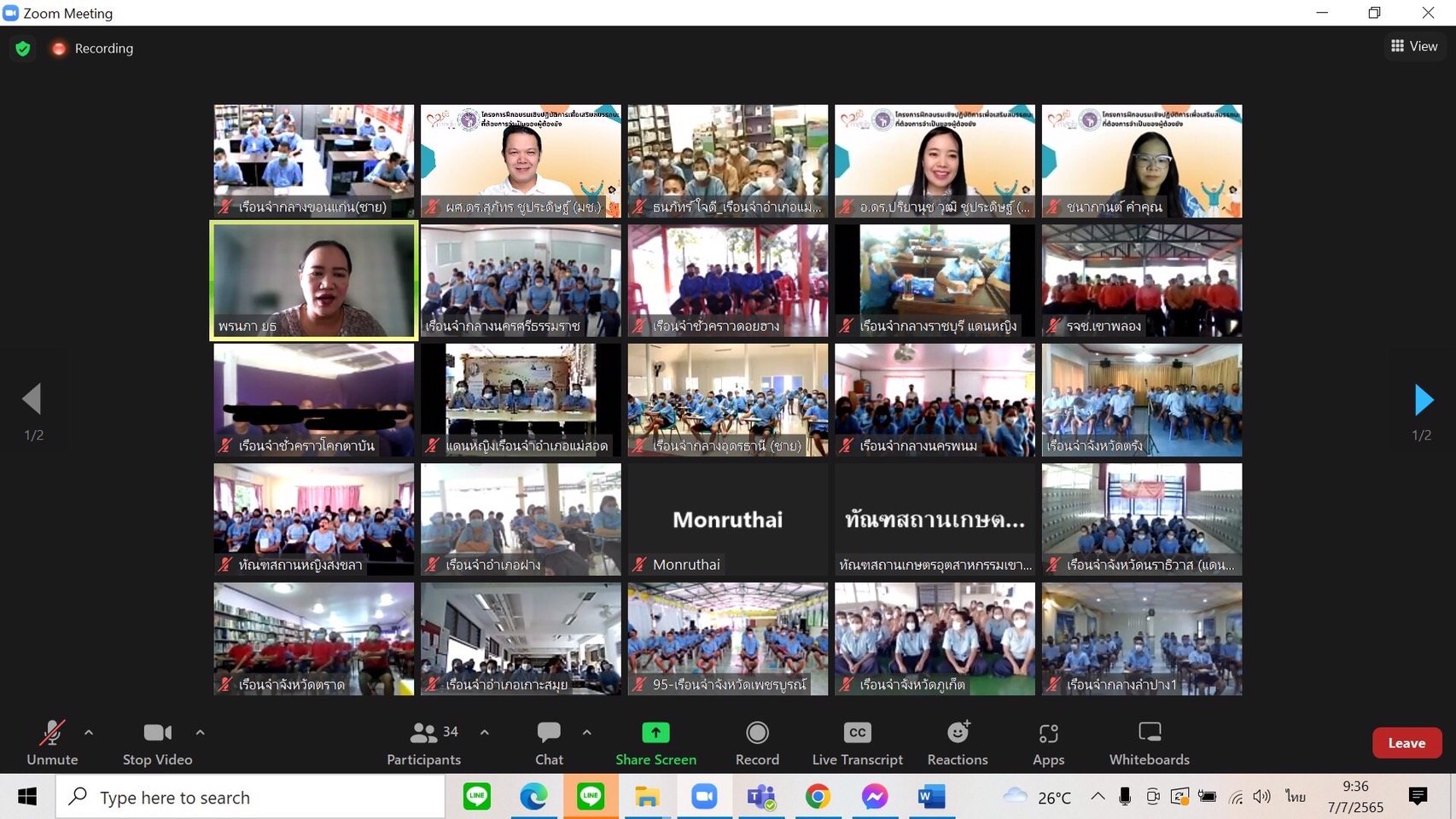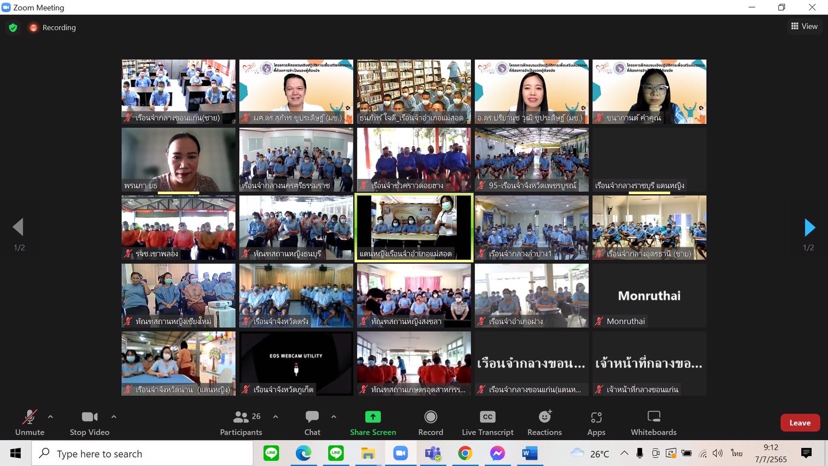 โครงการกำลังใจฯ อบรมออนไลน์เพื่อเสริมสร้างสมรรถนะที่ต้องการจำเป็นให้ผู้ต้องขัง รุ่นที่ 2 ในวันที่ 7 กรกฎาคม 2565 เวลา 09.00-15.00 น. โครงการกำลังใจฯ ได้จัดโครงการฝึกอบรมเชิงปฏิบัติการเพื่อเสริมสร้างสมรรถนะที่ต้องการจำเป็นให้ผู้ต้องขัง รุ่นที่ 2 โดยมีเรือนจำ/ทัณฑสถาน เข้าร่วมการอบรม 26 เรือนจำ รวม 29 ห้องเรียน ได้แก่ เรือนจำกลางอุดรธานี (แดนชายและหญิง) เรือนจำกลางระยอง (แดนหญิง) เรือนจำกลางราชบุรี (แดนหญิง) เรือนจำกลางนครพนม (แดนหญิง) เรือนจำกลางขอนแก่น (แดนชายและแดนหญิง) เรือนจำกลางนครศรีธรรมราช (แดนชายและหญิง) เรือนจำกลางลำปาง (แดนชาย) เรือนจำจังหวัดนราธิวาส (แดนหญิง) เรือนจำจังหวัดน่าน (แดนหญิง) เรือนจำจังหวัดกาญจนบุรี (แดนชาย) เรือนจำจังหวัดเพชรบูรณ์ (แดนชาย) เรือนจำจังหวัดตรัง (แดนชาย) เรือนจำจังหวัดตราด (แดนชาย) เรือนจำจังหวัดภูเก็ต (แดนหญิง) เรือนจำจังหวัดสุโขทัย (แดนหญิง) เรือนจำชั่วคราวดอยฮาง เรือนจำชั่วคราวเขาพลอง เรือนจำชั่วคราวโคกตาบัน เรือนจำอำเภอแม่สอด (แดนชายและหญิง) เรือนจำอำเภอเกาะสมุย (แดนชาย) เรือนจำอำเภอฝาง (แดนหญิง) ทัณฑสถานหญิงเชียงใหม่ ทัณฑสถานหญิงพิษณุโลก ทัณฑสถานหญิงสงขลา ทัณฑสถานหญิงธนบุรี และทัณฑสถานเกษตรอุตสาหกรรมเขาพริก โดยมีวิทยากร ได้แก่ ผศ.ดร.สุภัทร ชูประดิษฐ์ อาจารย์ ดร.ปริยานุช วุฒิ ชูประดิษฐ์ น.ส.ชนากานต์ คำคุณ จากมหาวิทยาลัยเชียงใหม่ สำหรับหัวข้อการเรียนรู้ในวันนี้คือ “การพัฒนาทัศนคติเชิงบวก” โดยมีการวัดระดับทัศนคติโดยใช้แบบคำถาม การให้ความรู้ การรับชมสื่อการสอน และวิเคราะห์เรื่องราวเกี่ยวกับทัศนคติ ในช่วงท้ายได้มีการสรุปการอบรม พร้อมการนำเสนอของผู้อบรม