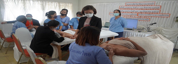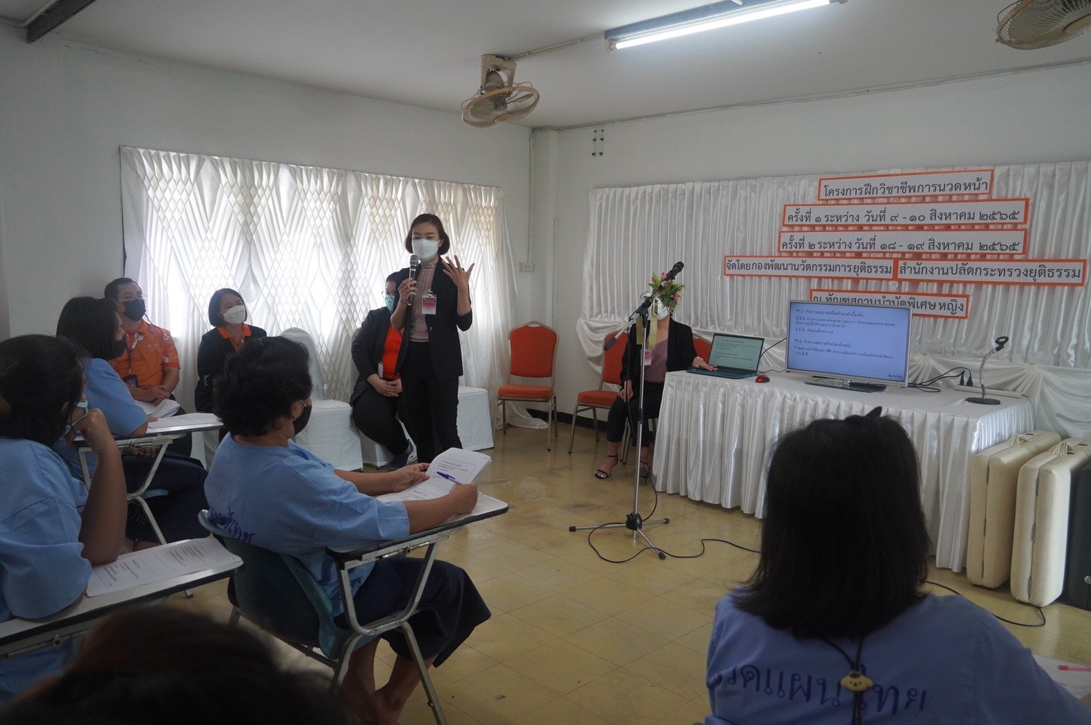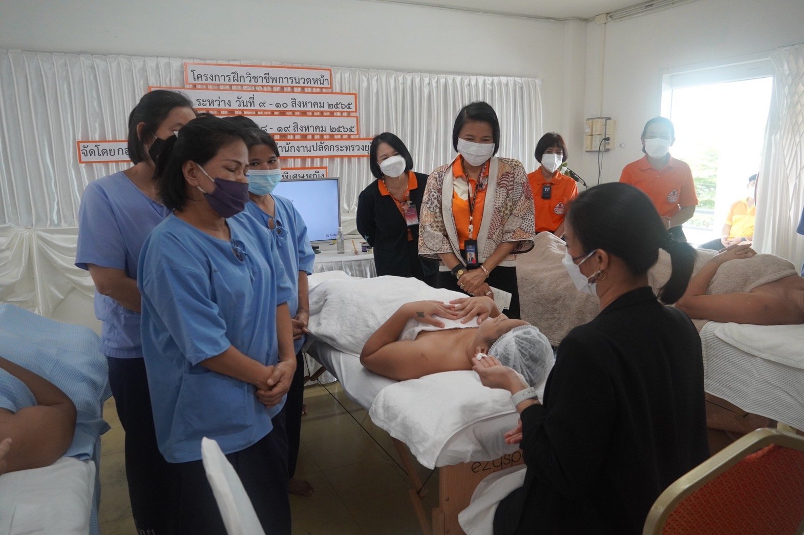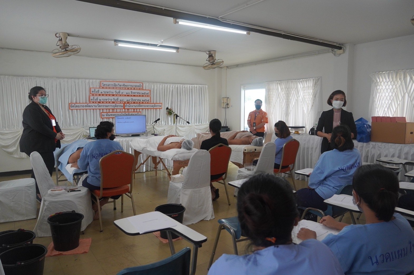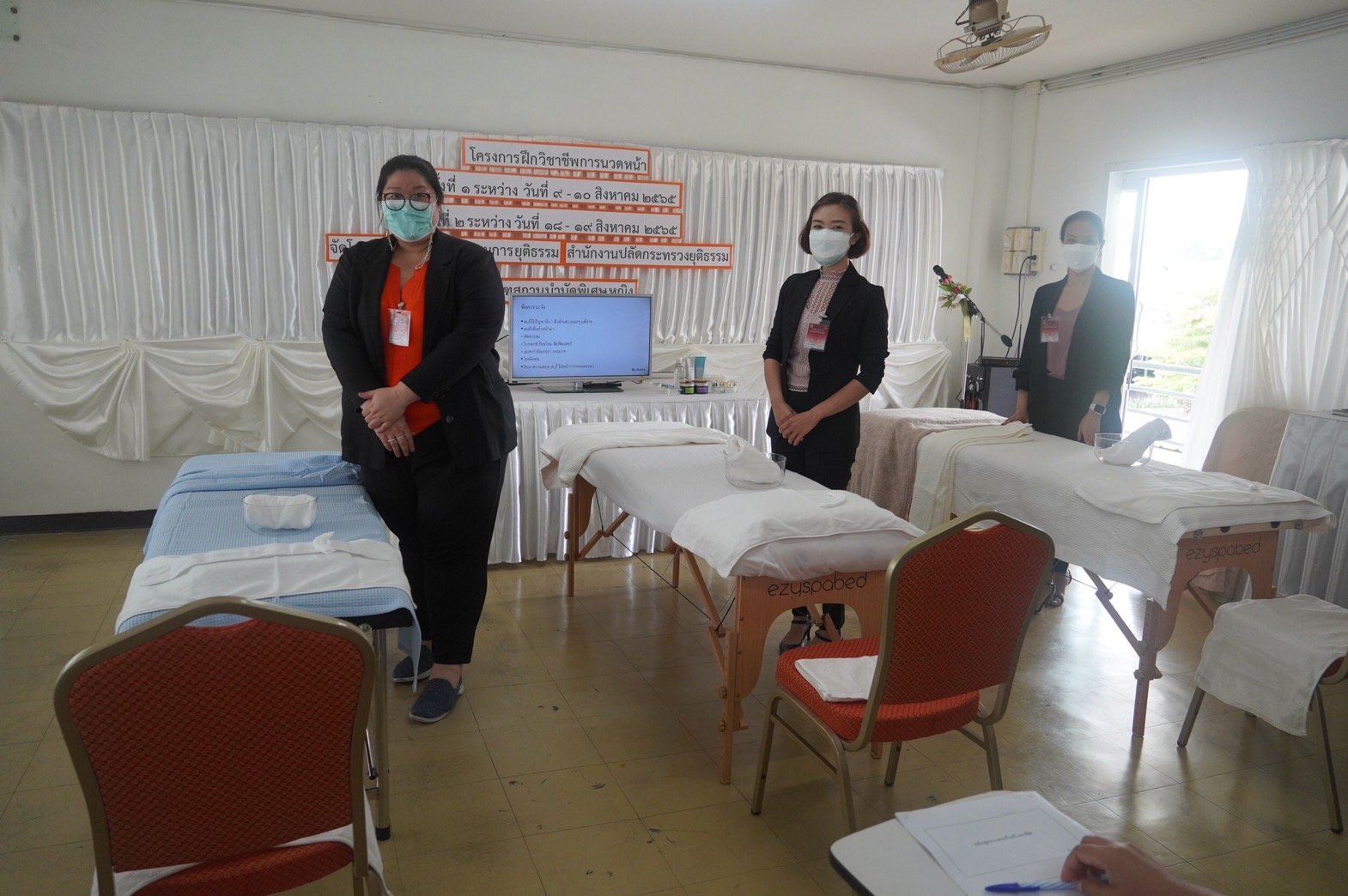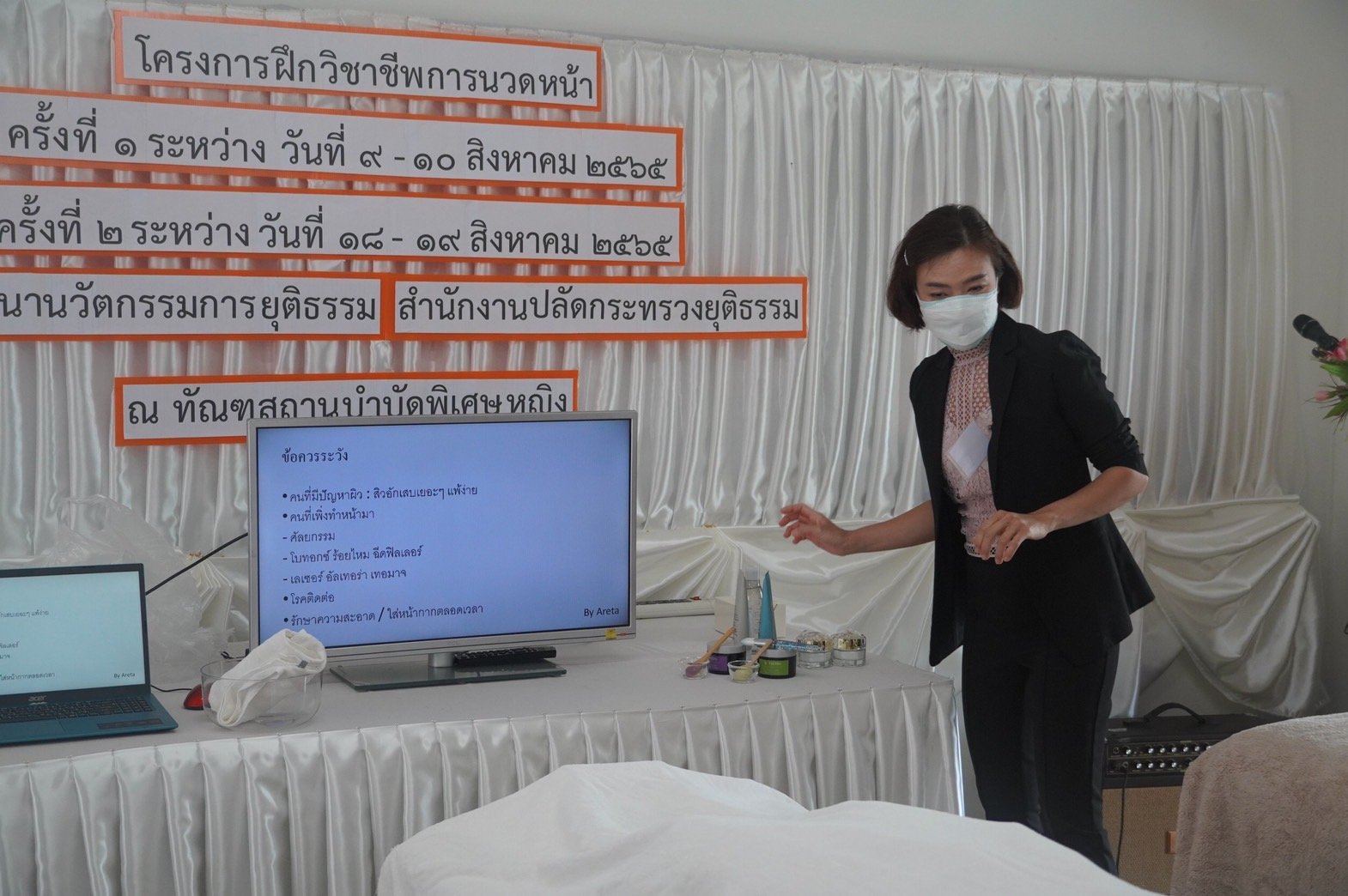 วันที่ 9 สิงหาคม 2565 กองพัฒนานวัตกรรมการยุติธรรม จัดโครงการฝึกวิชาชีพการนวดหน้า ณ ทัณฑสถานบำบัดพิเศษหญิง จังหวัดปทุมธานี โดยมีนางสาว สิดารัตน์ สรวงสมบูรณ์ นางสาว ไอริณ เหล่าสุนทรียา และนางสาวสุพจนา มธุรพร เป็นวิทยากร มีผู้เข้าร่วมการอบรม จำนวน 15 คน วิทยากรได้บรรยายเกี่ยวกับการทำความสะอาดผิวหน้าเบื้องต้น สครับผิวหน้า การเตรียมผิวหน้าด้วยเทคนิคประคบร้อน การนวดคอบ่าไหล่มาส์กหน้าและบำรุงผิวหน้า วิทยากรสาธิตขั้นตอนการทำความสะอาดผิวหน้าและสครับหน้าเป็นตัวอย่างและให้ผู้เข้ารับการอบรมจับคู่ฝึกปฏิบัติ ทั้งนี้ จากการพูดคุยสอบถาม ผู้เข้าร่วมการอบรมส่วนใหญ่มีทักษะด้านการนวดแผนไทยอยู่ก่อนแล้วและมีความสนใจเข้ารับการอบรมการนวดหน้า เนื่องจากเป็นวิชาชีพใหม่สามารถนำความรู้ไปต่อยอดร่วมกับการนวดแผนไทย เพื่อสามารถนำไปประกอบอาชีพนวดแผนไทยและสปาเชิงธุรกิจครบวงจรภายหลังพ้นโทษได้
