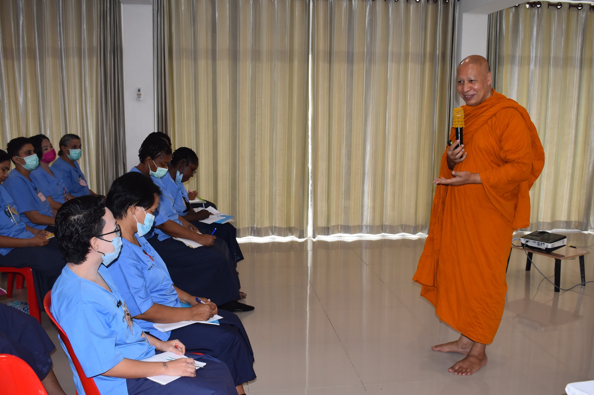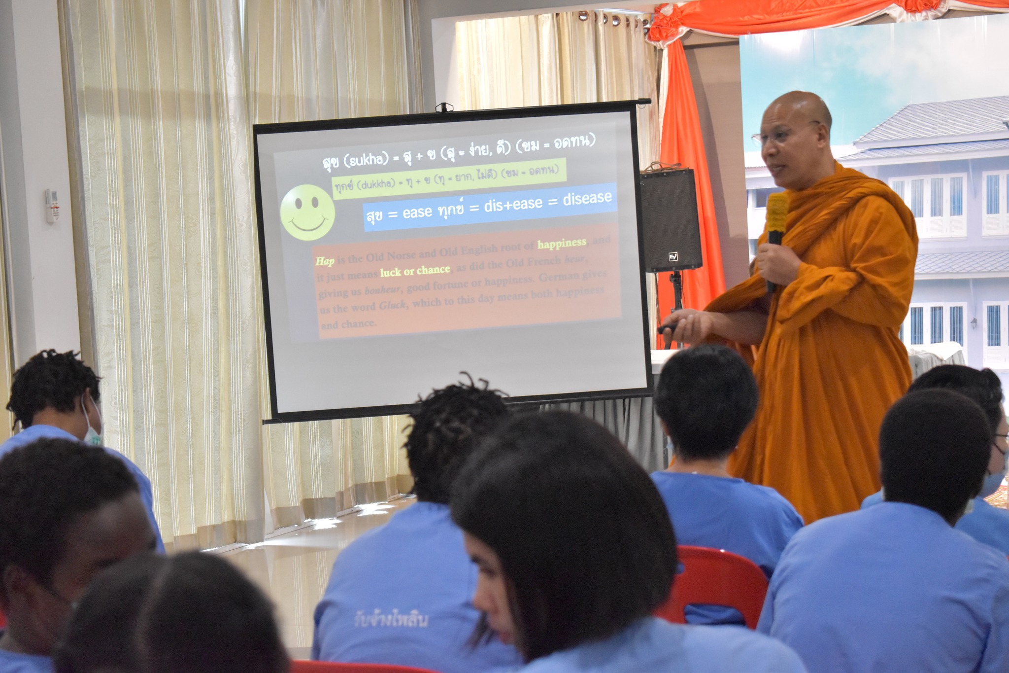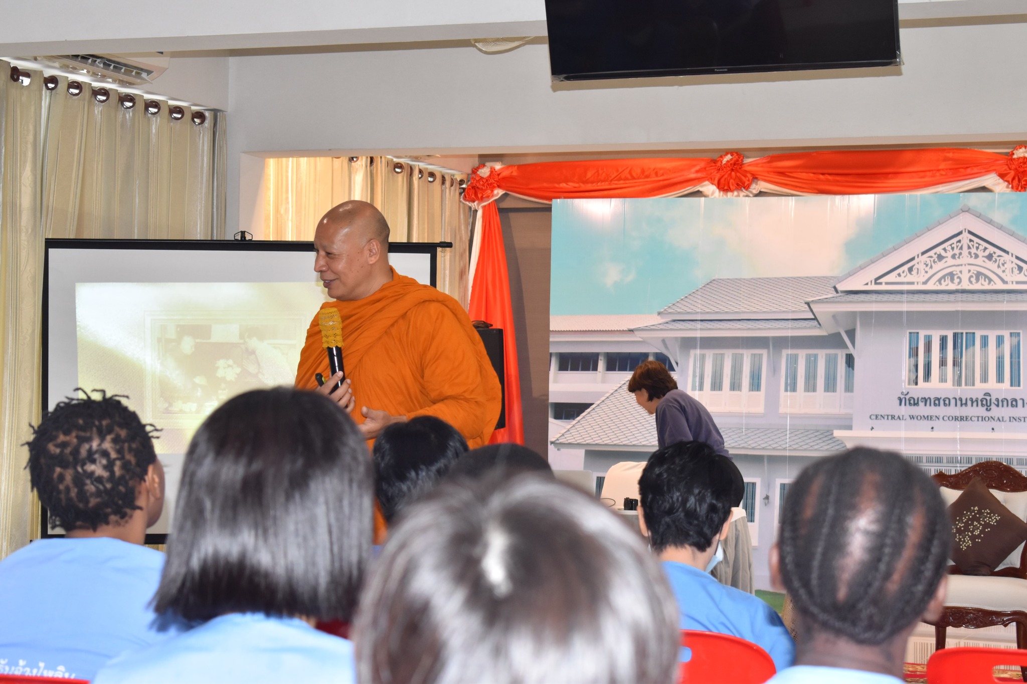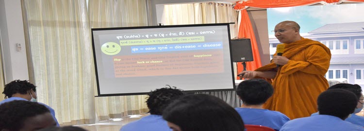 วันที่ 24 พฤษภาคม 2567 กองพัฒนานวัตกรรมการยุติธรรม ได้จัดโครงการปัญญาบําบัดเพื่อพัฒนาคุณภาพชีวิตผู้ต้องขัง ณ ทัณฑสถานหญิงกลาง กรุงเทพมหานคร โดยพระธรรมศากยวงศ์วิสุทธิ์ (อนิลมาน ธมฺมสากิโย) เป็นพระวิทยากร โดยบรรยายกิจกรรม ปัญญาบําบัดให้กับผู้ต้องขังหญิงชาวต่างชาติ เกี่ยวกับการรู้จักตัวตน ที่แท้จริงของตนเอง และรู้จุดมุ่งหมายของชีวิต ด้วยการสํารวจ เพื่อทําความเข้าใจตนเองโดยแท้จริง ไม่นำตนเองไปเปรียบเทียบกับใคร และไม่ต้องพึ่งพาคนอื่น สิ่งนั้นคือ ความสุข และอิสระที่แท้จริง พระวิทยากรยังอธิบายถึงรากศัพท์ของคำว่า “สุข” = สุ+ข (สุ=ง่าย ดี, ขม=อดทน) รากศัพท์ของคำว่า “ทุกข์” ทุ+ข (ทุ=ยาก ไม่ดี, ขม=อดทน) และได้เปิดโอกาสให้ผู้ต้องขังแบ่งปันความเห็นเกี่ยวกับ คำว่า “สุข” ในภาษาของตนเองว่ามีนัยยะ หรือความหมายมาจากอะไร และพระวิทยากรได้จัดกิจกรรม แลกเปลี่ยนข้อคิดเห็นกับผู้ต้องขังในเชิงจิตวิทยา โดยมีกิจกรรมตอบคำถามเชิงจิตวิทยาเพื่อพิจารณาลักษณะนิสัยของแต่ละบุคคล ทั้งนี้ ผู้เข้าร่วมอบรมได้มีส่วนร่วมแสดงความคิดเห็น และให้ความร่วมมือในการอบรมครั้งนี้เป็นอย่างดี