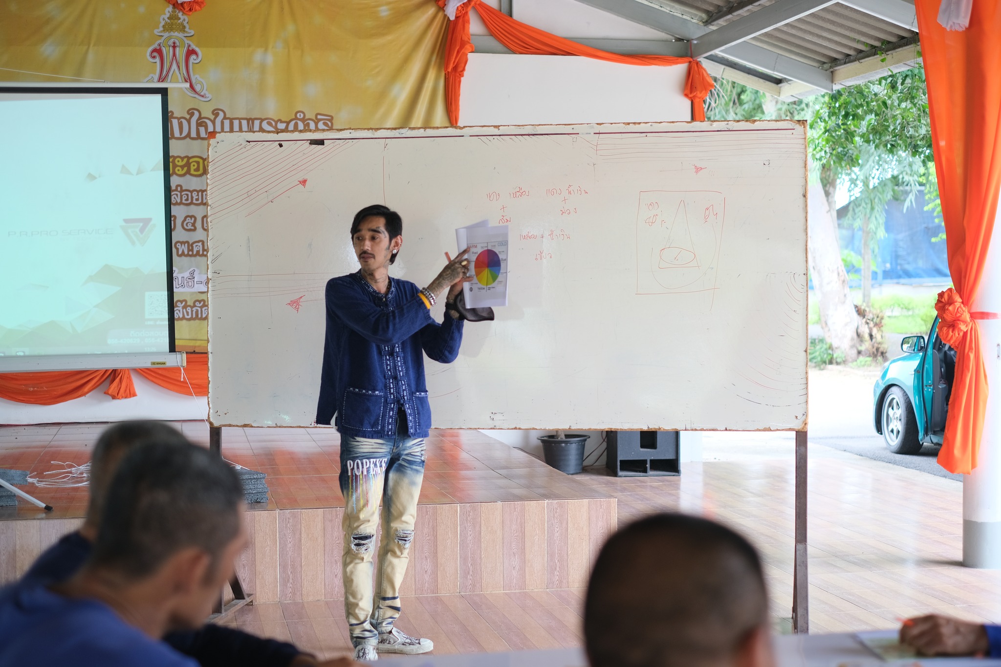 วิทยากรให้ผู้เข้าร่วมโครงการฝึกเกี่ยวกับการวาดเส้น การลากเส้น ในรูปแบบต่างๆ เช่น การลากเส้นตรงแนวนอน การลากเส้นตรงแนวเฉียง การลากเส้นโค้งครึ่งวงกลม การวาดแรเงารูปทรงเรขาคณิตและให้ความรู้เกี่ยวกับพื้นฐานของสี ประเภทของสีและอุปกรณ์ที่จะใช้ในการวาด หลักการการผสมสีจากเบสแม่สี แดง เหลือง น้ำเงิน และการวาดเส้น