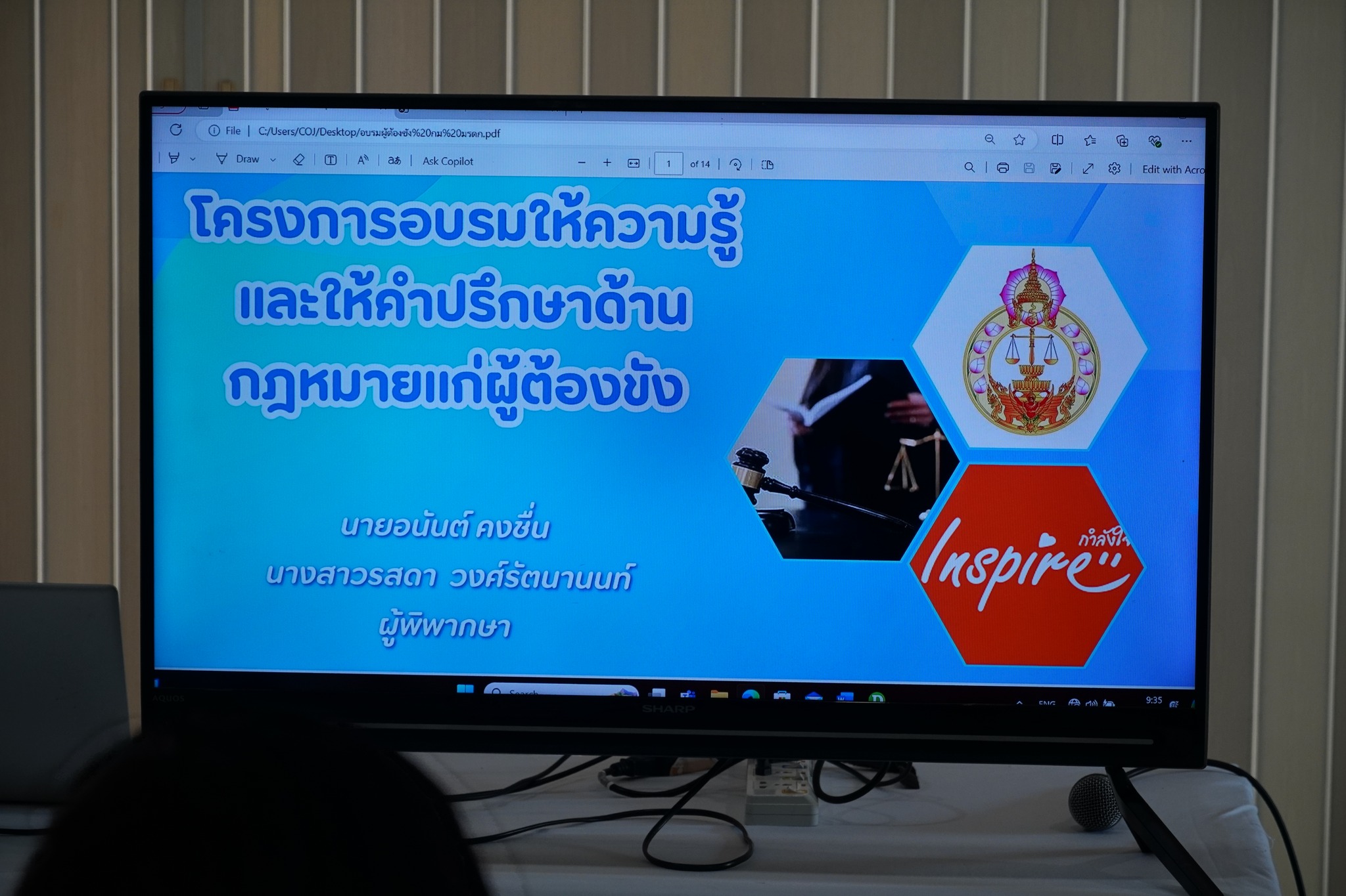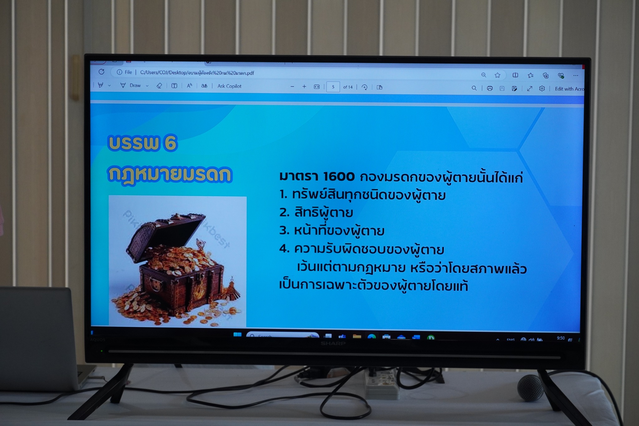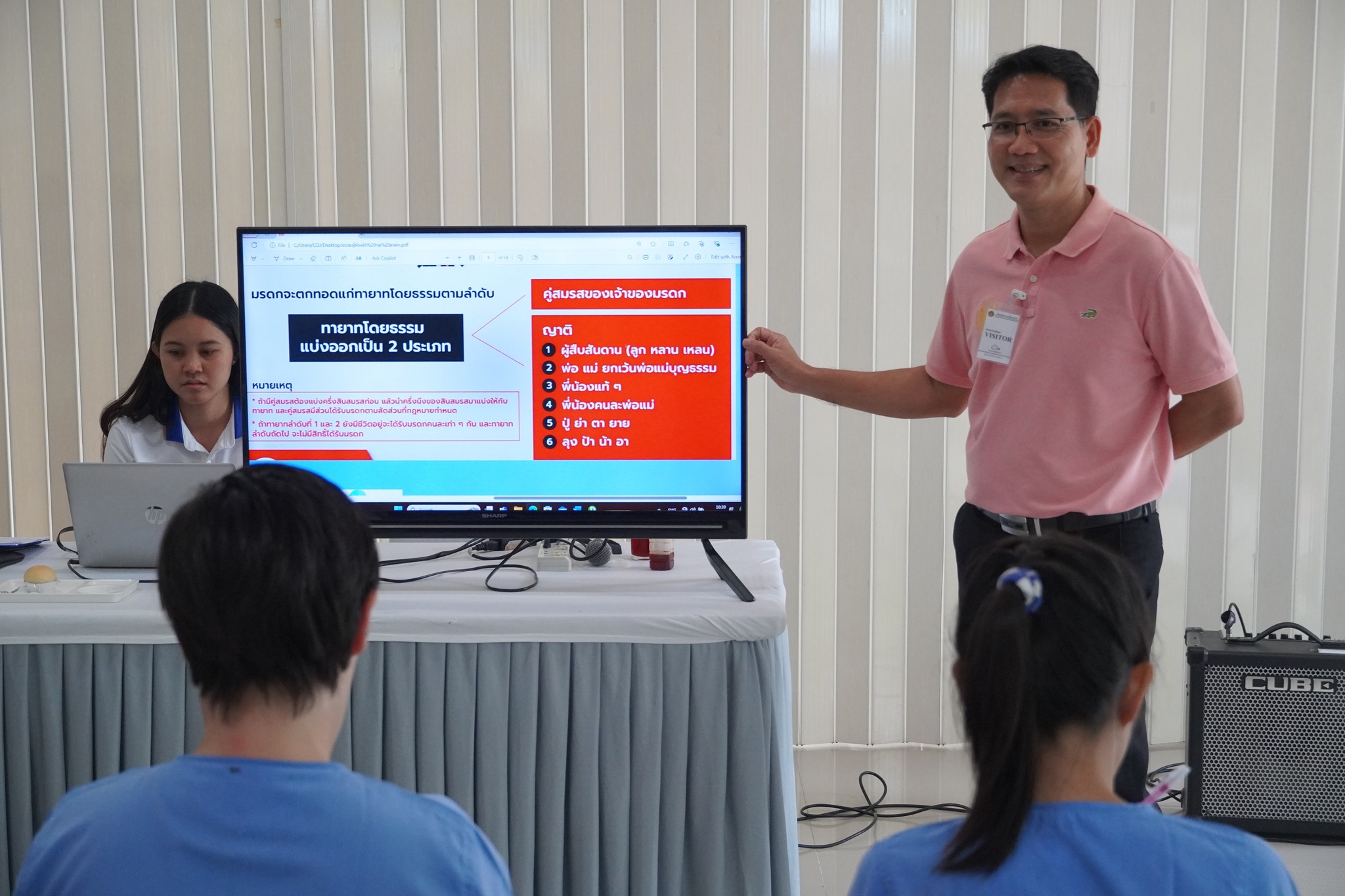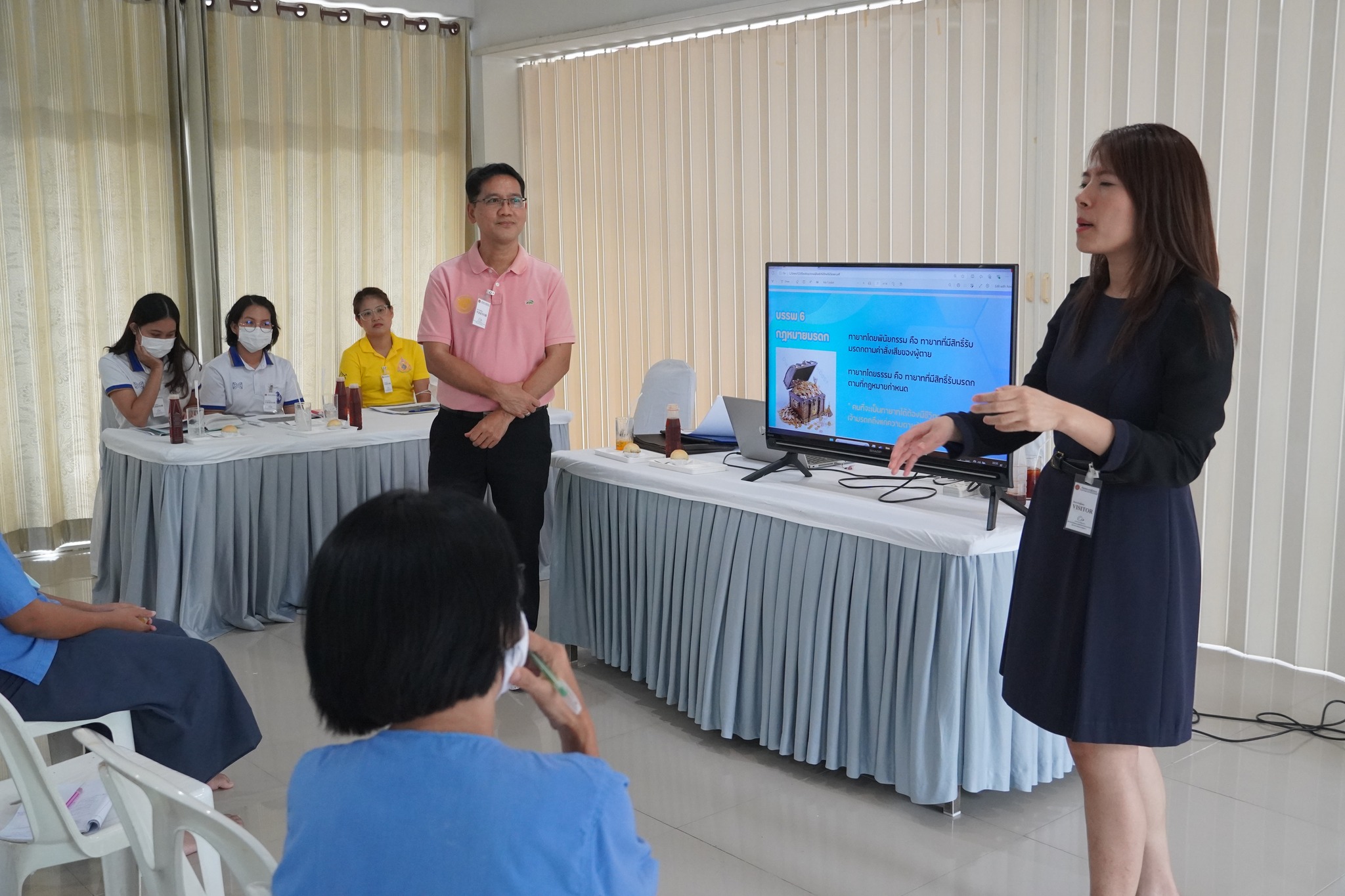 วิทยากรบรรยายให้ความรู้เรื่องเกี่ยวกับกฎหมายมรดก ความรู้เบื้องต้นเรื่องกองมรดกของผู้ตาย ทรัพย์สิน สิทธิ หน้าที่ และความรับผิดชอบของผู้ตาย เว้นแต่ตามกฎหมายโดยสภาพเป็นการเฉพาะตัวของผู้ตาย ความรู้เกี่ยวกับทายาทโดยธรรม ประเภทของทายาทโดยธรรม ทายาทโดยพินัยกรรม และประเภทของการทำพินัยกรรม ทั้ง 6 ประเภท รวมทั้งเงื่อนไขของการทำพินัยกรรม ซึ่งผู้เข้าอบรมได้ร่วมซักถามข้อสงสัยและให้ความสนใจในหัวข้อดังกล่าวเป็นอย่างมาก โดยในช่วงท้ายได้ให้คำปรึกษาทางด้านคดีความ เพื่อลดภาวะเครียดคลายความวิตกกังวล และให้กำลังใจผู้เข้าร่วมอบรม