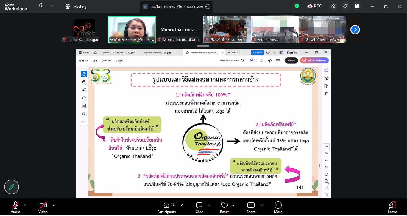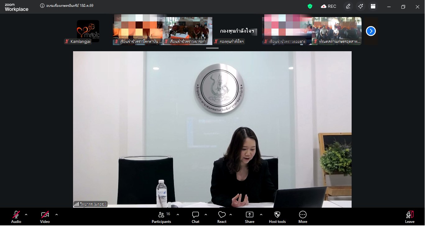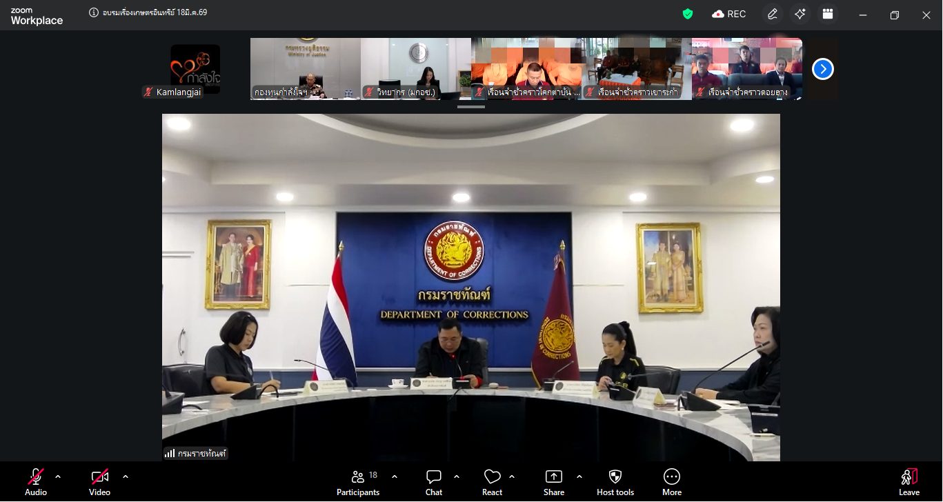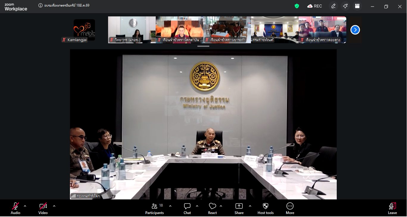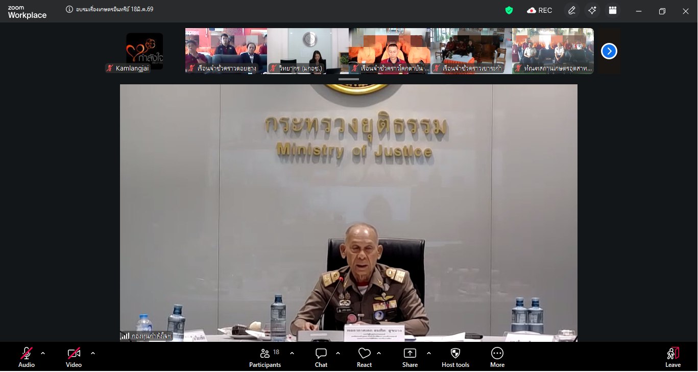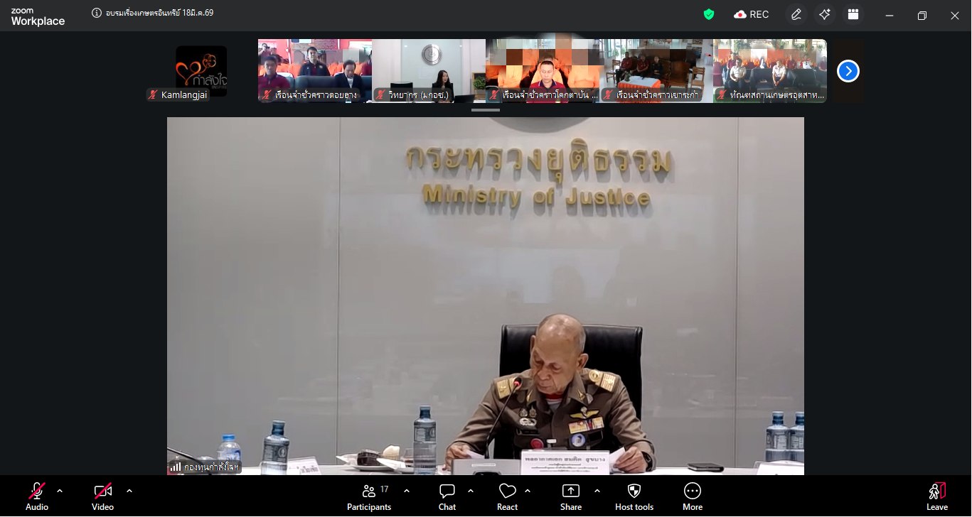 เมื่อวันที่ 18 มีนาคม 2569 กองพัฒนานวัตกรรมการยุติธรรม ได้จัดโครงการอบรมการพัฒนาสู่มาตรฐานเกษตรอินทรีย์ในผลผลิตทางการเกษตร และการเลี้ยงสัตว์ของเรือนจำชั่วคราวนำร่องเศรษฐกิจพอเพียงโครงการกำลังใจฯ ผ่านระบบออนไลน์ โดยมี พลอากาศเอก สมคิด สุขบาง กรมวังผู้ใหญ่ประจำพระองค์ สมเด็จพระเจ้าลูกเธอ เจ้าฟ้าพัชรกิติยาภา นเรนทิราเทพยวดี กรมหลวงราชสาริณีสิริพัชร มหาวัชรราชธิดา รองประธานกองทุนกำลังใจฯ เป็นประธานในพิธีเปิด ร่วมด้วยนางจิรภา สินธุนาวา รองปลัดกระทรวงยุติธรรม พันตำรวจโท ประวุธ วงศ์สีนิล อธิบดีกรมราชทัณฑ์ และผู้บัญชาการเรือนจำและผู้แทน เรือนจำชั่วคราวนำร่อง 6 แห่ง ได้แก่ เรือนจำชั่วคราวเขาระกำ จังหวัดตราด เรือนจำชั่วคราวแคน้อย จังหวัดเพชรบูรณ์ เรือนจำชั่วคราวดอยฮาง จังหวัดเชียงราย เรือนจำชั่วคราวเขาพลอง จังหวัดชัยนาท เรือนจำชั่วคราวโคกตาบัน จังหวัดสุรินทร์ และทัณฑสถานเกษตรอุตสาหกรรมเขาพริก จังหวัดนครราชสีมา มีนางสาวมนทิชา สรรพอาสา นักวิชาการมาตรฐานชำนาญการพิเศษ สำนักงานมาตรฐานเกษตรและอาหารแห่งชาติ (มกอช.) และนางสาวสุวิภา คำแหง นักวิชาการเกษตรปฏิบัติการ กองพัฒนาระบบและรับรองมาตรฐานสินค้าพืชกรมวิชาการเกษตร เป็นวิทยากร มีผู้ต้องขัง และเจ้าหน้าที่ที่รับผิดชอบ เข้าร่วมกิจกรรมการอบรม จำนวน 180 คน