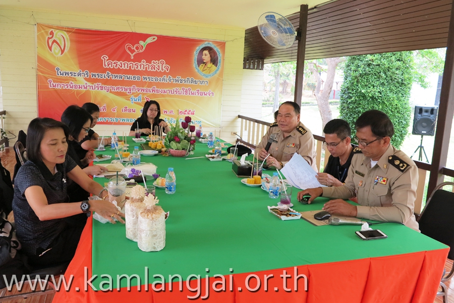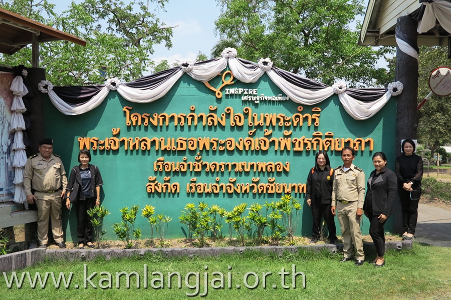 ในการนี้ นายเวชยันต์ ลูกอินทร์ ผู้บัญชาการเรือนจำจังหวัดชัยนาท และนายสำรวย พ่วงมี หัวหน้าเรือนจำชั่วคราวเขาพลอง และนายอำนาจ ข้องพูล พนักงานคุมประพฤติจังหวัดชัยนาท บรรยายสรุปผลการดำเนินงานโครงการกำลังใจในการน้อมนำปรัชญาเศรษฐกิจมาปรับใช้ในเรือนจำชั่วคราวเขาพลอง จากนั้นได้ลงพื้นที่เรือนจำชั่วคราวเขาพลอง เพื่อรับทราบปัญหาและอุปสรรค นอกจากนี้ ยังได้เข้าเยี่ยมชมแดนหญิง เรือนจำจังหวัดชัยนาท เพื่อเก็บข้อมูลและคัดเลือกผลิตภัณฑ์ที่ผู้ต้องขังหญิงมีความชำนาญและเป็นที่ต้องการของตลาดเพื่อยกระดับและเพิ่มมูลค่าให้สามารถจัดจำหน่ายได้ในช่องทางการตลาดต่างๆ อาทิ การฝึกอาชีพการทำเครื่องหมายอินทรธนู เย็บลูกปัดตกแต่งเสื้อ การทำเบเกอรี่ การซักอบรีด