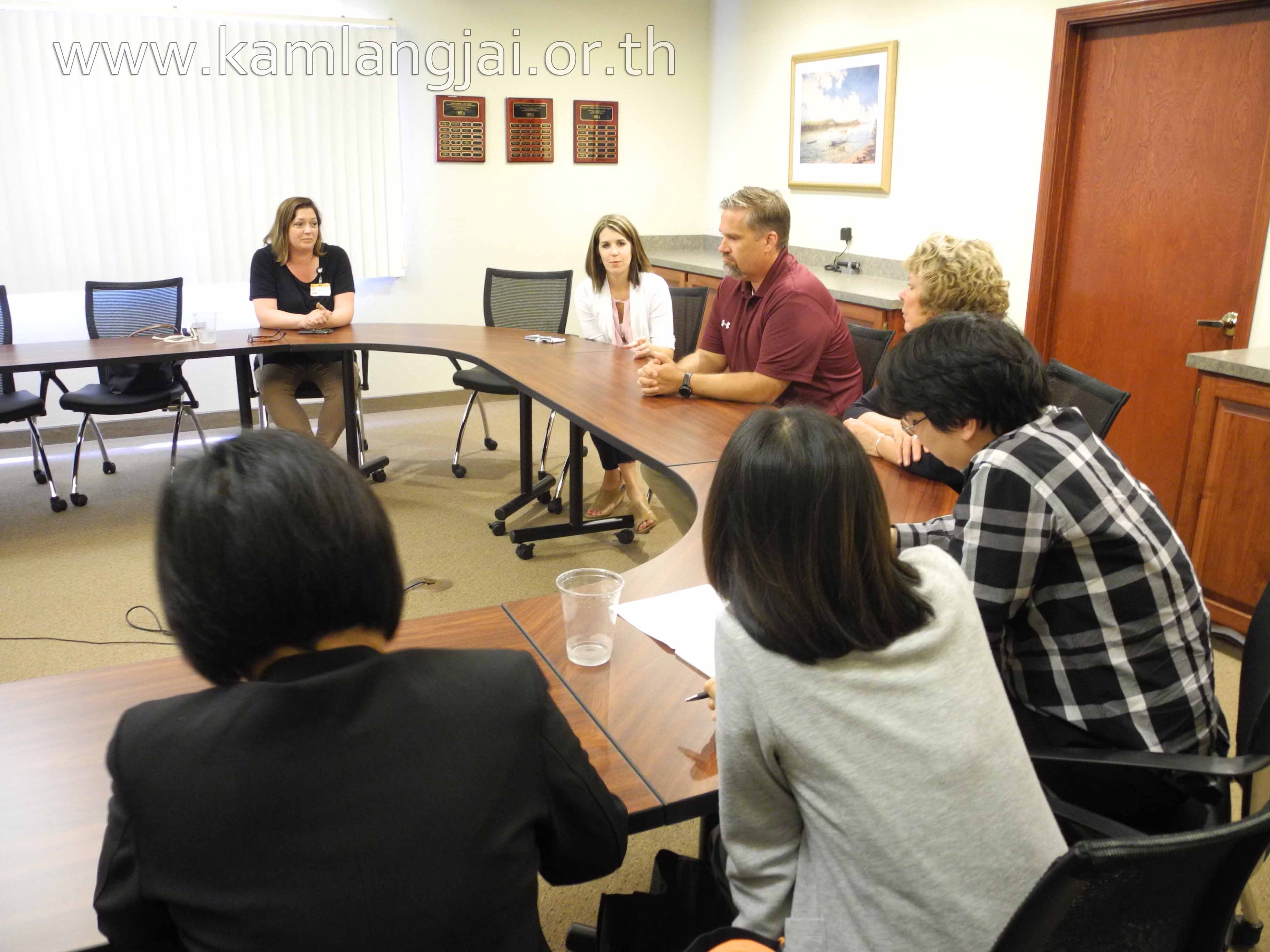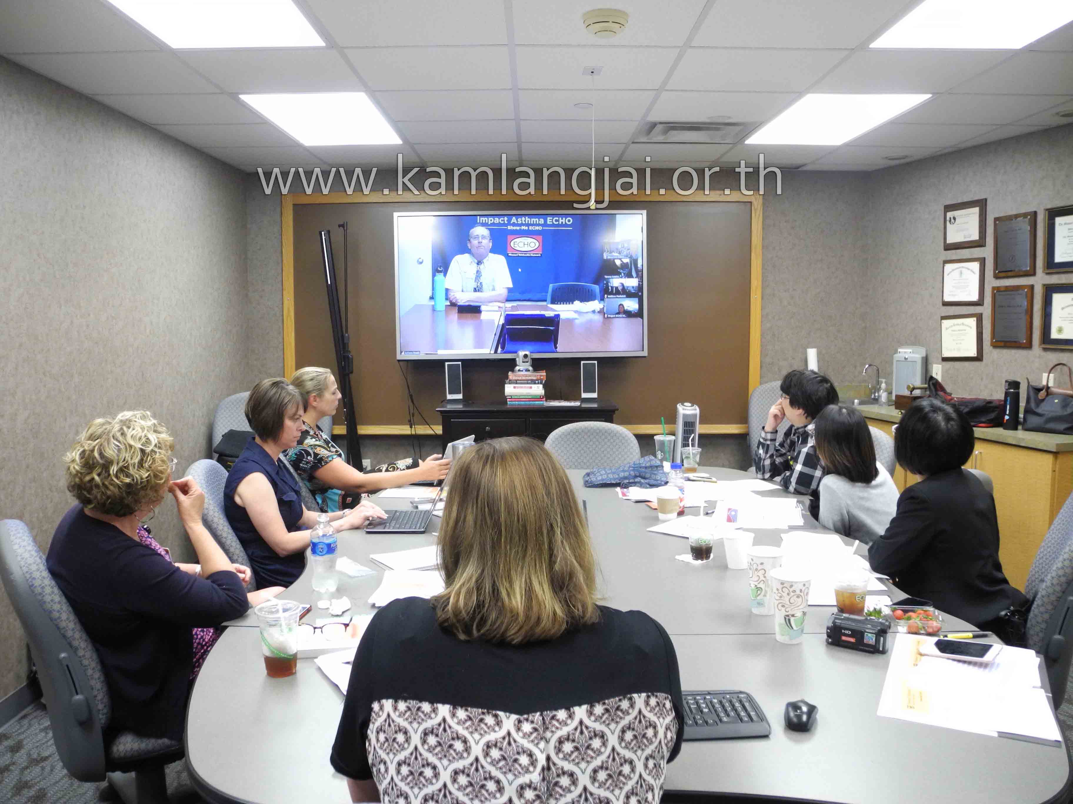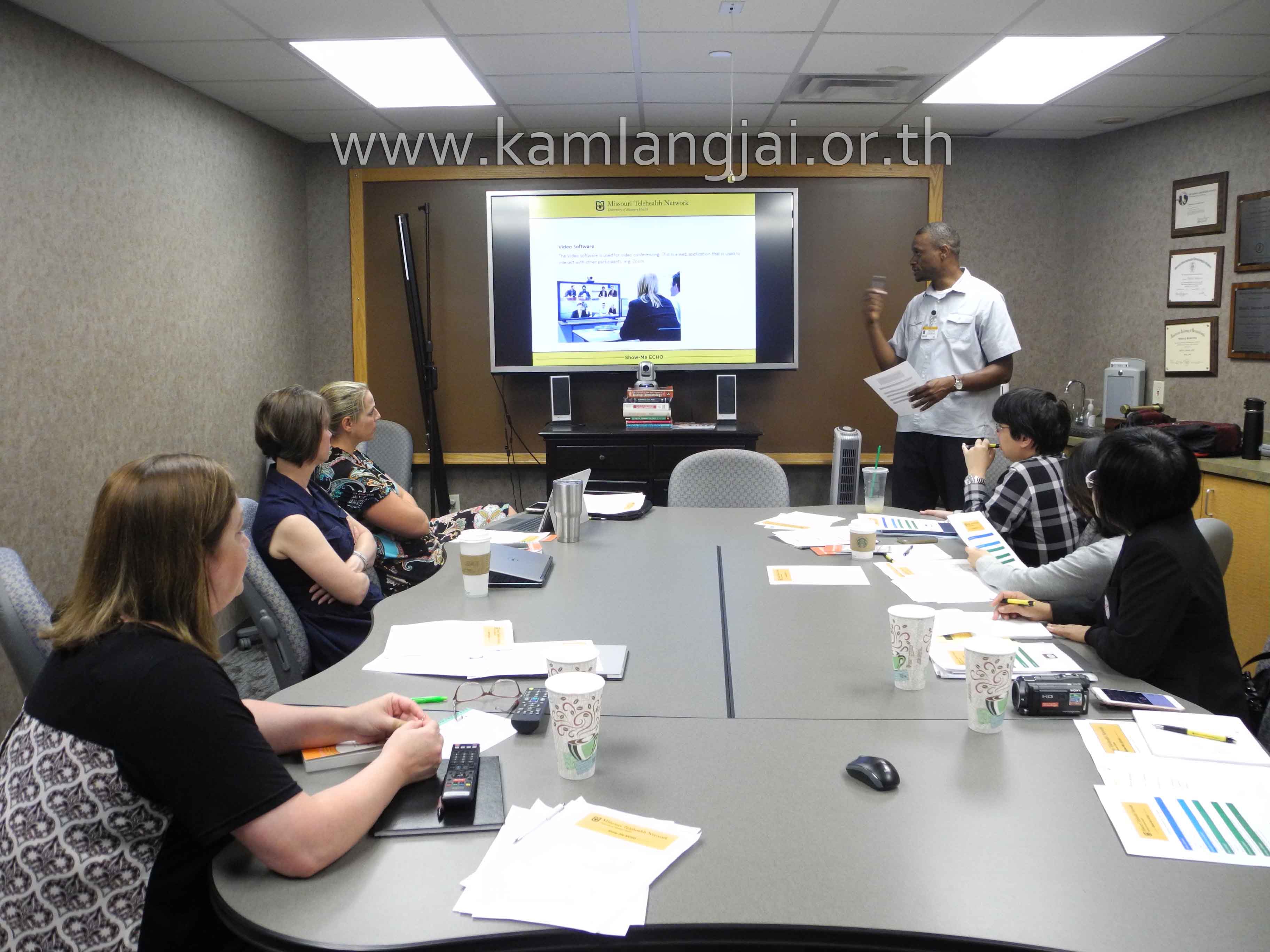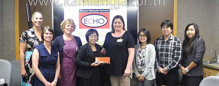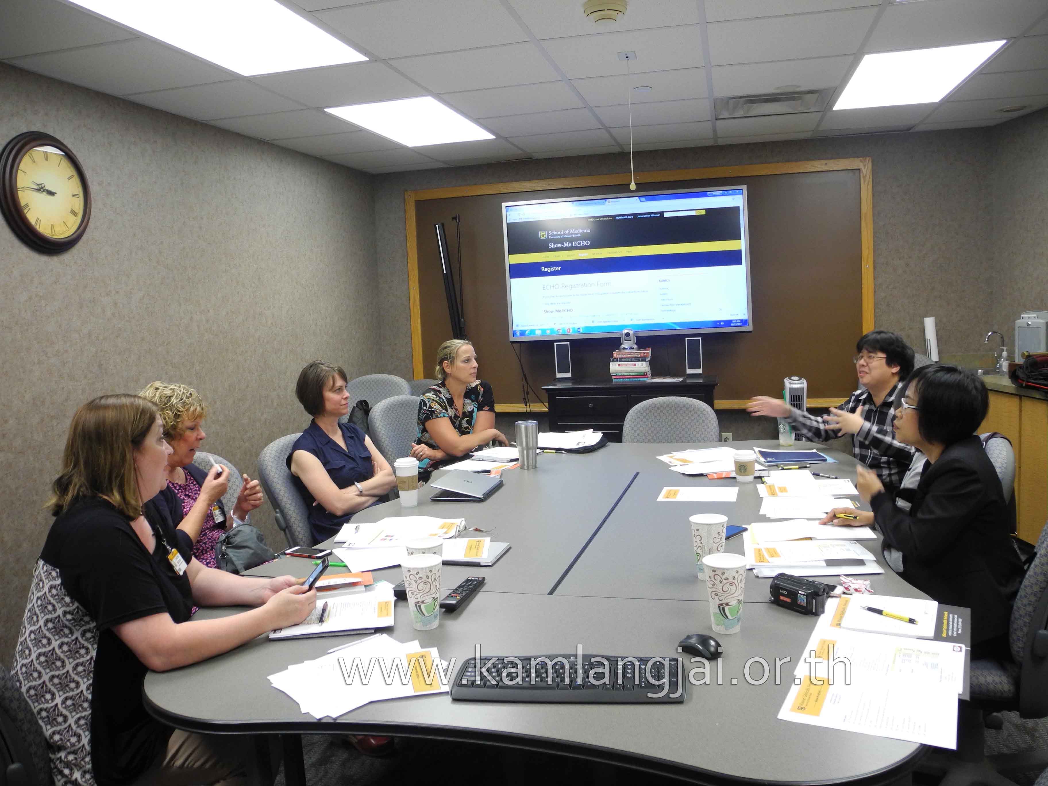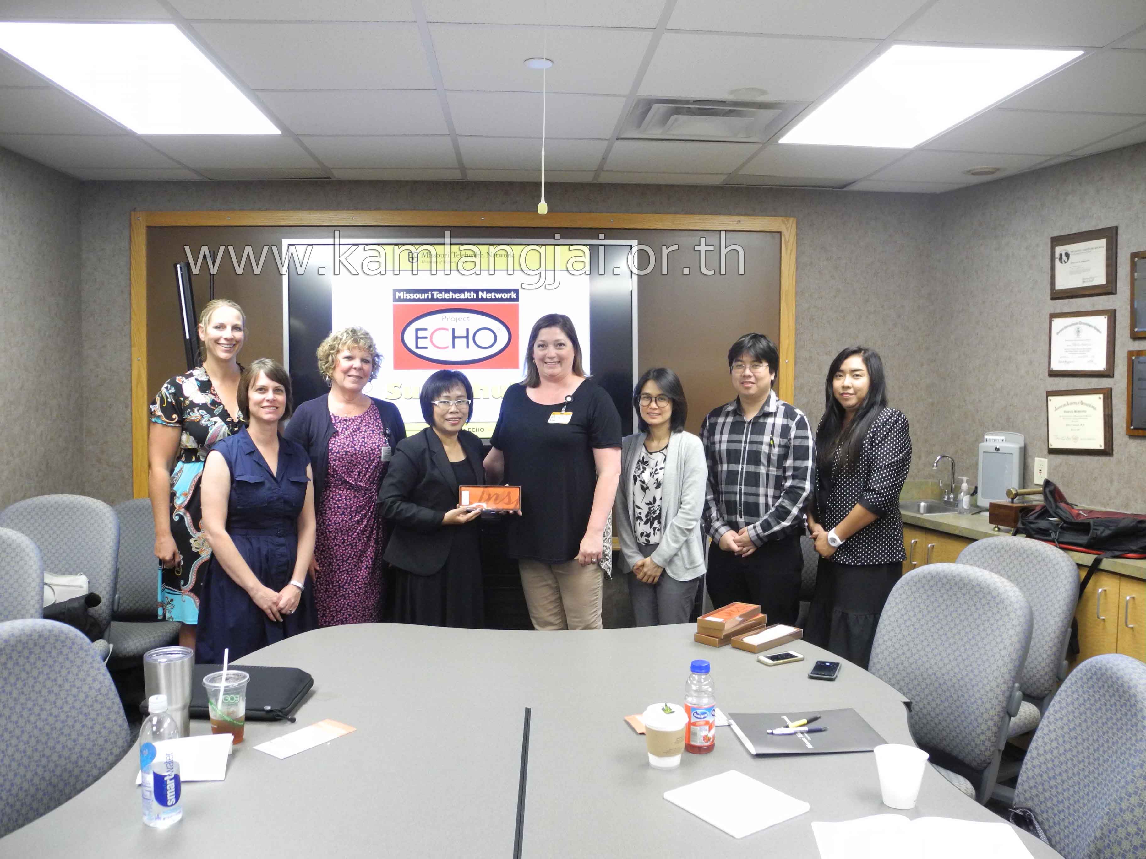 โดยในวันที่ 13 มิถุนายน 2560 ตัวแทนจากโครงการกำลังใจฯ และศูนย์วิชาการสารเสพติดฯ ได้รับการต้อนรับจาก E. Rachel Mutrux ตำแหน่ง Senior Program Director เข้าร่วมประชุมทำความเข้าใจเบื้องต้นเกี่ยวกับระบบ ECHO (ชื่อเรียกระบบโทรเวชกรรมของม.มิสซูรี) ด้วยคลิปการนำเสนอ Echo โดย Dr.Sanjeev Arora จากเวที TEDX จากนั้น Lindsey Beckmann ตำแหน่ง Replication Coordinator ในเรื่องของการเตรียมตัวใช้ระบบ ECHO จำเป็นจะต้องคำนึงถึงอะไรบ้าง ต่อมา Gwen Ratermann ตำแหน่ง Senior Program Coordinator อธิบายกฎเกณฑ์และความรับผิดชอบต่อการใช้ ECHO กลยุทธ์การใช้ ECHO ให้ประสบความสำเร็จตามที่ตั้งไว้ ต่อด้วยการนำเสนอเทคโนโลยีชื่อ ZOOM สำหรับระบบ ECHO โดย Michael Oyewole ตำแหน่ง Technology Analyst ภายหลังจากที่ได้รับชมตัวอย่างจริงการเชื่อมต่อ ECHO ระหว่าง แพทย์จากโรงพยาบาล และ Hub จากบ้านพัก เกี่ยวกับโรคหอบหืด โดยในช่วงบ่าย ได้เดินทางสู่ Missouri Primary Care Association เจฟเฟอร์สันซิตี้ เพื่อแลกเปลี่ยนประสบการณ์และสอบถามจาก Rich Lillard, PhD. แพทย์ชนบทผู้ใช้ระบบ ECHO ในการวินิจฉัยโรค